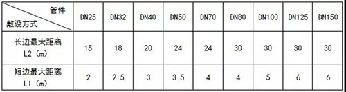 對于本文所述系統(tǒng)由固定點起,允許不裝補償器的直管段最大長度民用建筑為33m,工業(yè)建筑為42m。(管道伸長量分別為40mm和50mm)。實際設(shè)計時一般每段臂長不大于20~30m,不小于2m。在自然補償兩臂頂端設(shè)置固定支架。“г”型補償器一般用于DN150以下管道;最大允許距離與管徑關(guān)系見表1。“Z” 型補償器可以看做兩個“г”型補償器。