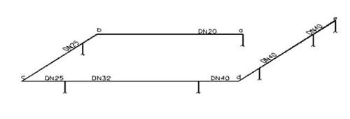 c-d段上設(shè)h和k點,這樣g-c和c-h形成“г”型補償器, k-d和d-p形成另一“г”型補償器。根據(jù)管徑查表1知c-h長度介于2.5m到18m之間,本系統(tǒng)定為15m; k-d長度介于3m到20m之間,本系統(tǒng)定為15m.。h-k長度為33m設(shè)置一個方形補償器,詳見國標(biāo)圖N106,本不再贅述。設(shè)定好固定支架和補償器的系統(tǒng)如圖2所示。