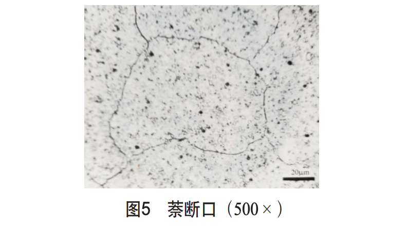 我們曾發現φ200mm×3mm鍛件M2鋼制中齒鋸刀片銑刀,淬火金相檢驗時發現一邊有萘斷口,而對邊組織正常,萘斷口形貌如圖5所示。