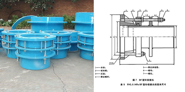 BF型單法蘭松套限位補(bǔ)償接頭是在AF型法蘭松套補(bǔ)償接頭的基礎(chǔ)上增設(shè)限位伸縮管及限位螺柱而成,最大伸縮量處用雙螺母鎖定,補(bǔ)償因熱脹冷縮和地基沉降引起的管線軸向位移及撓曲和偏心,從而保護(hù)閥門的設(shè)備。