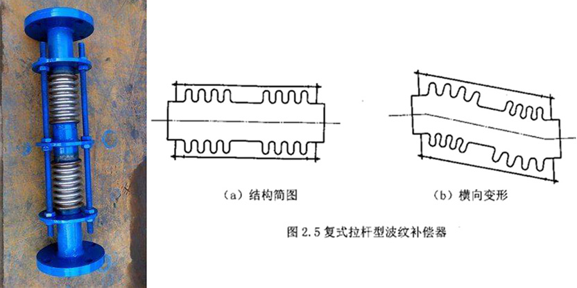大拉桿波紋補(bǔ)償器的組成及工作原理:由中間接管連接的兩個波紋管及拉桿、端板等組成的的撓性裝置,以橫向位移方式補(bǔ)償平面或立體彎曲管段的熱位移,拉桿裝置應(yīng)能承受壓力推力及其附加外力的作用。 復(fù)式拉桿型波紋補(bǔ)償器特別適合吸收橫向位移,此外,這種設(shè)計形式也可用于吸收軸向位移,角位移以及任意由這三種形式合成的位移,一般用法是將這種帶連桿的波紋補(bǔ)償器設(shè)置在呈90°的“Z”形管系的中間管臂內(nèi),調(diào)整連桿以阻止外部的軸向位移