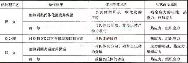 在熱處理時可能引起體積變化和形狀變化的原因見下表。表中“體積變化原因”一欄未列入鋼因熱脹冷縮現(xiàn)象而產(chǎn)生的體積變化,鋼由淬火加熱溫度到零下溫度進行冷處理,隔熱管托均隨溫度的變化而有相應(yīng)的體積變化,因熱脹冷縮而引起的體積變化不均勻乃是熱應(yīng)力產(chǎn)生的原因,而且對變形有相當(dāng)?shù)挠绊憽?/span>