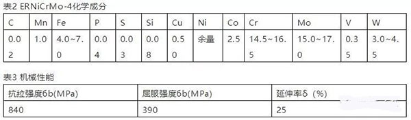 3. 焊接材料:焊絲采用ERNiCrMo-4φ2.0,其化學成分和機械性能見表2、表3,保護