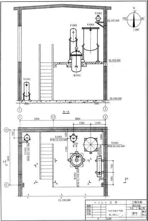 (2)尺寸  圖中要標注與設備定位有關的建筑物定位軸線的編號、設備支承點(POS)標高和設備管口的標高、設備的名稱與位號等。圖中尺寸的單位除標高及總平面圖以米為單位外,其他尺寸均以毫米為單位。地面設計標高為EL100.00。