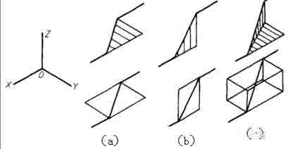 2)當管道平行于直角坐標軸時,軸測圖用平行于對應的軸測軸的直線繪制;當管道不平行于直角坐標軸時,應畫出平行于相應坐標軸的細實線,表示管子所處的平面;管道在水平面內傾斜時,畫出與y軸平行的細實線(構成水平面),(a)管道在鉛垂面內傾斜時,畫出平行于Z軸的細實線(構成鉛垂面),(b)管道是一般位置時,需要同時畫出與Y軸和Z軸分別平行的細實線,如圖(c) 所示。