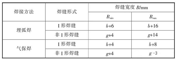 焊縫最大寬度Bmax和最小寬度Bmin的差值,在任意50 mm焊縫長度范圍內偏差值不得大于4.0 mm,且整個焊縫長度范圍內偏差值不大于5.0 mm。焊縫寬度應符合表2中的規定,其焊縫圖如圖7和圖8所示。