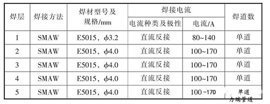 (1)基層材料為碳素鋼或低合金鋼,由于組對應力、偏析、合金元素等原因,產生裂紋傾向的將增大,為保證焊接質量,焊接材料選用型號為E5015的堿性碳鋼焊條。為了既適應坡口尺寸,又能保證施焊效率,采用了2種直徑的焊條,分別是φ3.2 mm 和 φ4.0 mm。