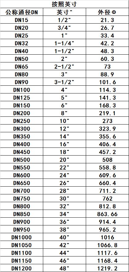 三者的闡述基本就這樣,下面我們來用兩份表格來了解DN、"、Φ之間的換算和關系。