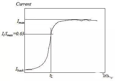 式中:F 為法拉第常數;D 為擴散系數;Δx=L 為試樣的厚度,cA=c1=0, 因為 A 端 H 原子已全部氧化成為 H+;c0=cC 是充氫端濃度,當充氫電流 Ic 恒定時,它也是常數,故式(1)也可寫成:Imax=FDc0/L, 或 c0=L*Imax/DF通過測量滲氫電流密度 Imax, 即可由式(2)計算出鋼中的原子氫的濃度。找到滲氫曲線中 It/Imax=0.63 所對應的滯后時間 tL,代入公式 D=L2/6tL,來計算不同溫度下的擴散系數 D 值,典型的滲氫電流曲線如圖 2 所示。測量研究電極與輔助電極間的電流可得到氫滲電流與時間的關系曲線,分析該曲線可得到氫在金屬中的擴散系數、材料中的氫濃度、氫陷阱數以及氫致開裂的行為等;測量陰極超電位并繪制超電位與時間的關系曲線,結合氫滲電流與時間的關系曲線可分析材料出現異常氫致開裂時氫在材料內部的行為機理。