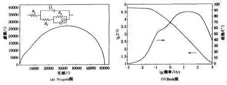 為了描述含有兩個時間常數的 EIS 結果,提出了如圖 1-1(c)所示的第三種等效電路。對于在涂層下或結垢下的腐蝕、緩蝕體系,甚至局部腐蝕,經常遇到這種情況。圖 1-1(c)中的電路元件的物理意義,會隨所代表的系統不同而有所不同。圖 1-4 是圖 1-1(c)所示等效電路的阻抗圖譜,該電路具有下列模擬數據:Rs=10Ω,R1=40kΩ,Q1=40uF 和指數 n=1.