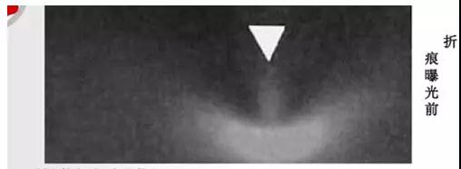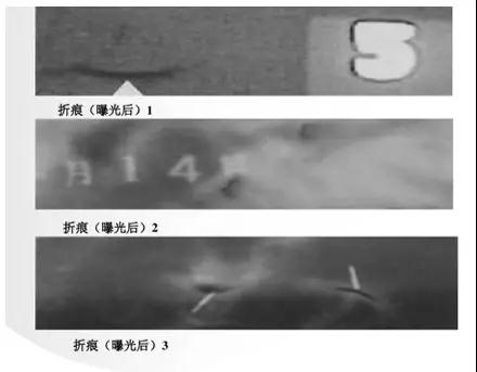 折痕(曝光前)的表征為白月牙狀顯示,其密度低于鄰近的膠片區域(黑度較低)。