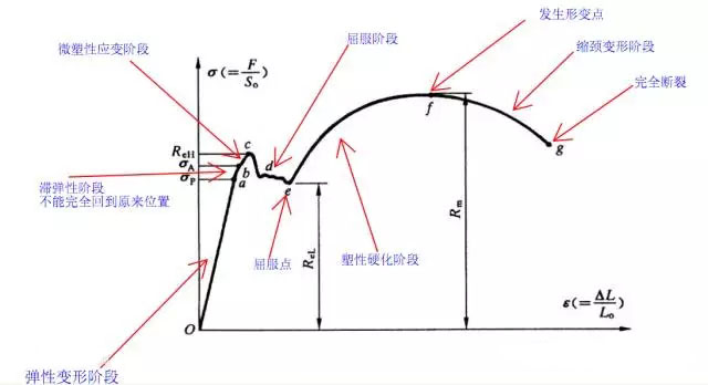 這一階段的最大、最小應力分別稱為上屈服點和下屈服點。由于下屈服點的數值較為穩定,因此以它作為材料抗力的指標,稱為屈服點或屈服強度(ReLRp0.2)