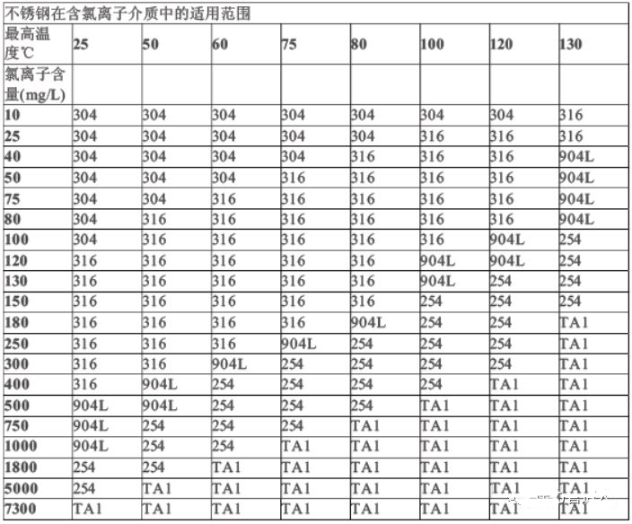 適用于一般的有機和無機介質。例如,天然冷卻水、冷卻塔水、軟化水;碳酸;濃度<50%的醋酸和苛性堿液;醇類和丙酮等溶劑;溫度≤100℃的稀硝酸(濃度<20%=、稀磷酸(濃度<30%=等。但是,不宜用于硫酸。由于約含2%的Mo,故在海水和其他含氯介質中的耐蝕性比304 型好,完全可以替代304 型。