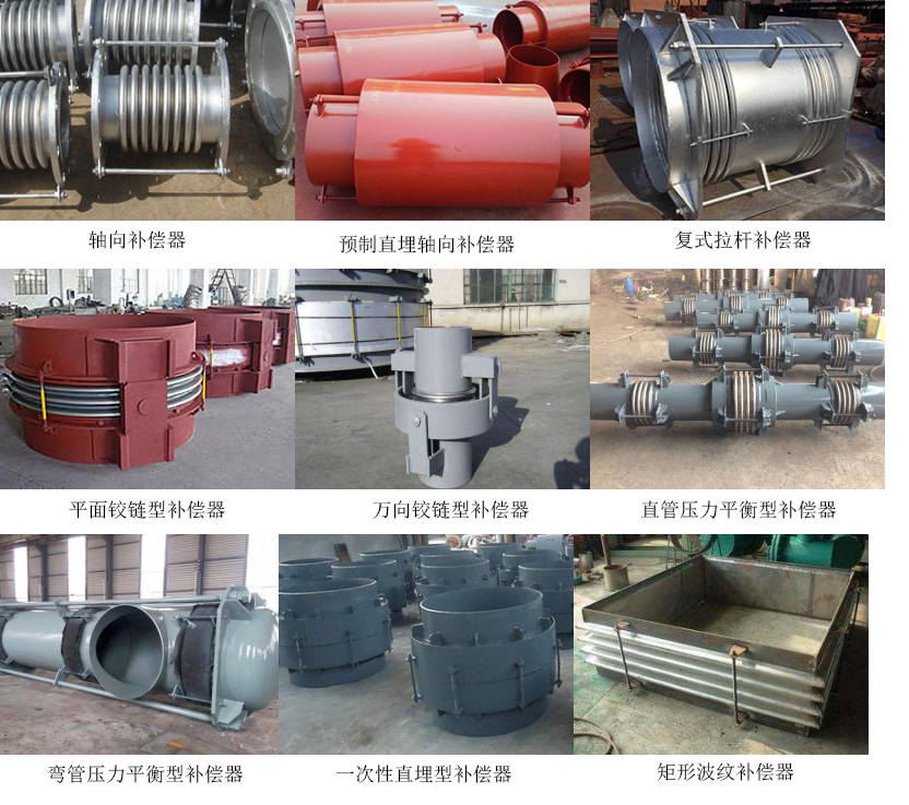 低溫軸向波紋補償器、高溫軸向波紋補償器、外壓軸向型波紋補償器、自由復式拉桿型波紋補償器、平面(萬向)鉸鏈型波紋補償器、復式鉸鏈型波紋補償器、直管壓力平衡型波紋補償器、彎管壓力平衡型波紋補償器、旁通直管壓力平衡型波紋補償器、直埋式波紋補償器、一次性直埋式波紋補償器