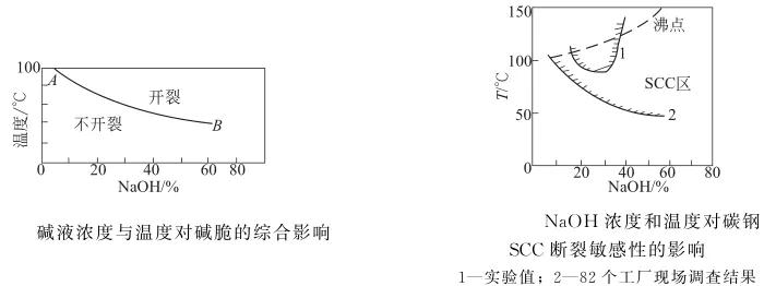 堿脆不僅與堿的濃度有關,還取決于溶液的溫度,見下圖: