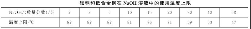 在環(huán)境溫度下,可以設計選用碳鋼設備裝載苛性堿,從強度、塑性和堿脆敏感性 3 方面綜合考慮,在最高溫度 46℃ 的苛性堿溶液的環(huán)境中,也能夠選用碳鋼, C 質(zhì)量分數(shù)約為 0.20% 的鎮(zhèn)靜鋼 ( 20g )是最合適的碳鋼。
