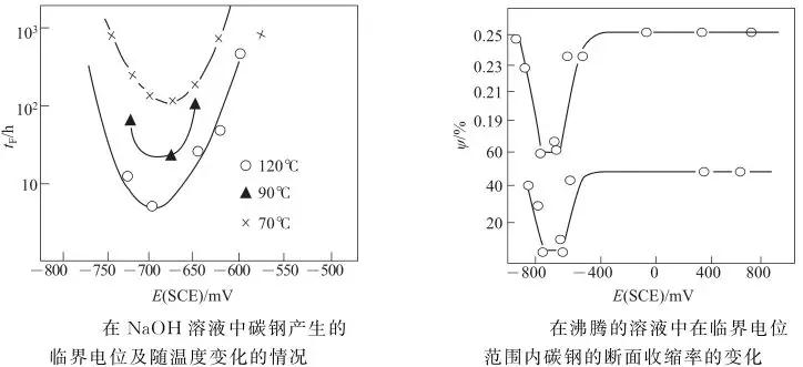 低碳鋼鋼在沸騰的質(zhì)量分數(shù)為35%~40% NaOH 溶液中堿脆的敏感電位范圍為-1150~800mV ( SCE ),在沸點 ( 120℃ )下鋼的堿脆發(fā)生在 -700mV ( SCE )左右的很窄電位范圍內(nèi),如下圖所示。