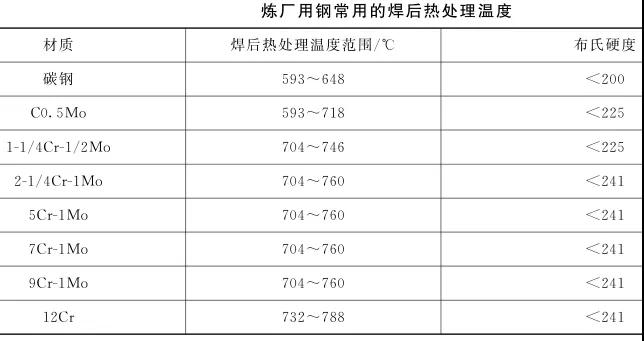 碳鋼和低合金鋼焊后去應力退火溫度不低于 620℃ ,并按照 1h / 25mm (厚度)計算保溫時間。下表是煉廠用鋼常用的焊后熱處理溫度范圍,硬度值可以作為熱處理效果的判據(jù)。