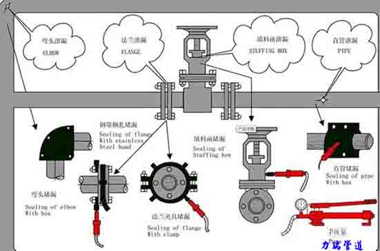 通常是采用相應的盒式卡具,把泄露部位完全包封起來,然后往密閉腔注入密封劑消除泄露,注入密封劑方法與法蘭密封法相同,還可按適用溫度、壓力、介質設計的密封環槽卡具,在槽中裝上石棉盤根,把此夾具裝在泄露部位上,再向環槽上的石棉盤根注密封劑及使盤根壓緊夾具的各連接點,而消除泄露。