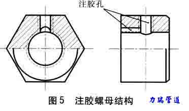 4、螺紋連接部位泄露的密封方法  隔熱管托將卡蘭卡在螺紋泄露部位的外表面,用頂絲頂緊,通過頂絲內孔,用約直徑為3--4mm的長鉆頭鉆透陰螺紋壁,然后裝上注射槍注入少量密封劑,即能迅速消除泄露。