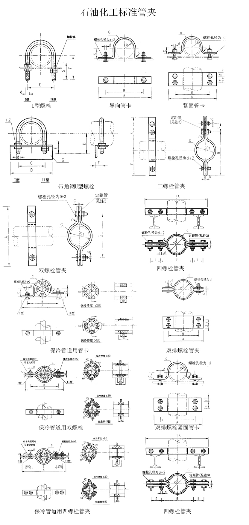 A1 U型螺栓;A2 U型螺栓(帶角鐵);A3導(dǎo)向管卡;A4 緊固管卡;A5 基準(zhǔn)型雙螺栓管夾;A6 重型雙螺栓管夾;A7 三螺栓管夾;A8三螺栓管夾(支托用);A9 雙排螺栓管夾;A10四螺栓管夾;A11雙排螺栓壓緊管夾;A12 管卡(保冷管道);A13 雙螺栓管夾(保冷管道);A14 四螺栓管夾(保冷管道)。